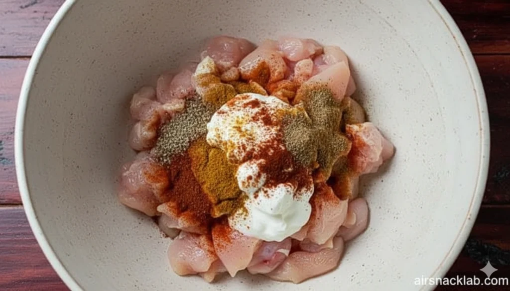 Proper marination is essential for juicy air-fried chicken.