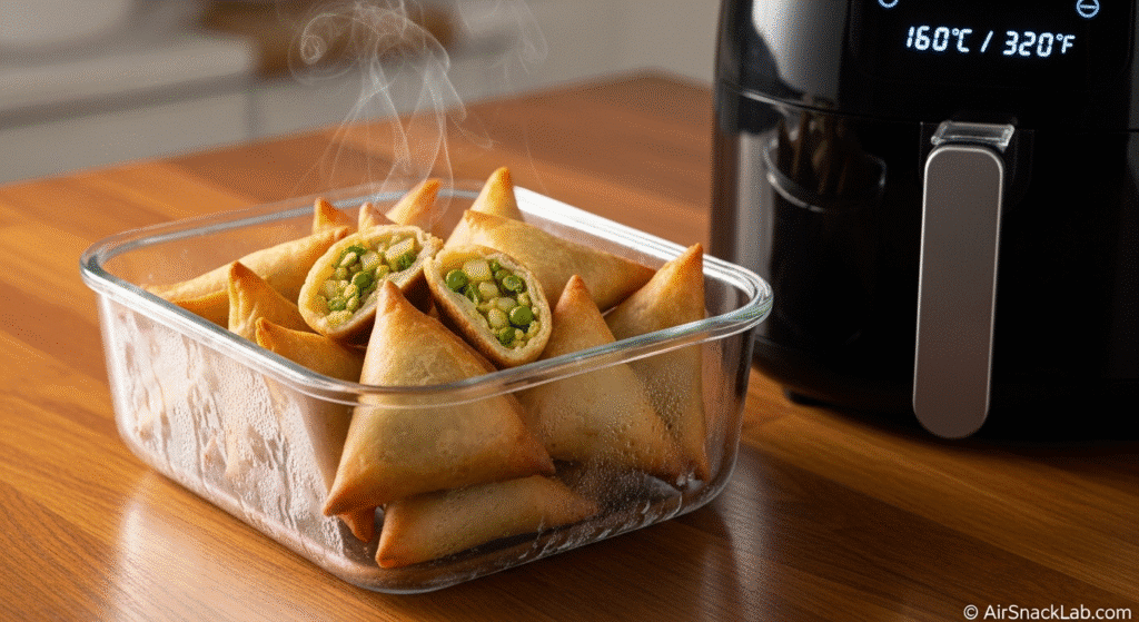 Store your samosas in an airtight box and reheat in the air fryer for 3–4 minutes — crisp again, just like fresh.
