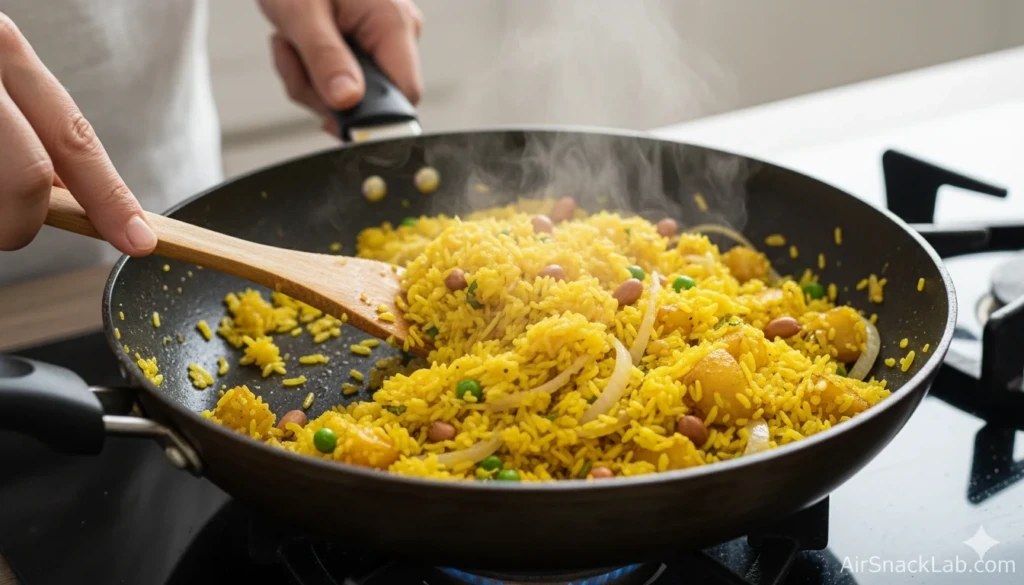 If the poha looks too dry, sprinkle 1–2 tablespoons of water and mix very gently. Cover the pan and steam on low heat for 2–3 minutes. This helps the poha recipe stay soft and moist without becoming sticky.